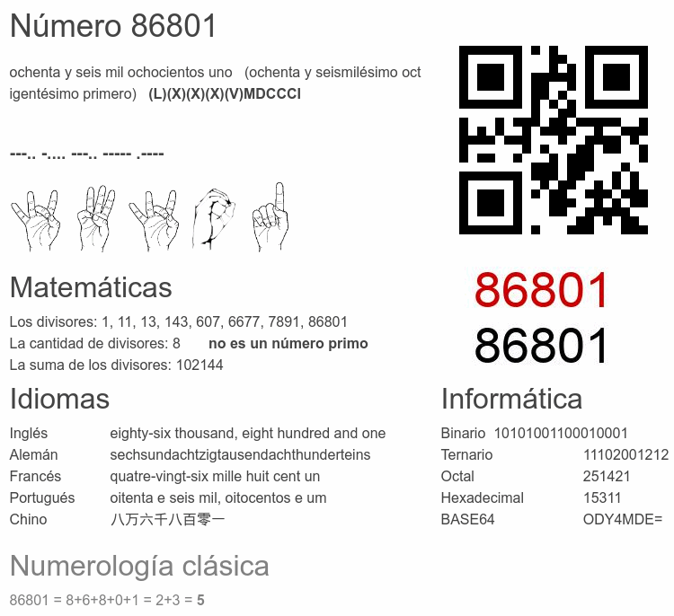 Número 86801 en el código morse: ---.. -.... ---.. ----- .----Lengua de Signos Española 86801: