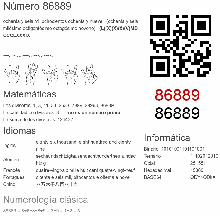 Número 86889 en el código morse: ---.. -.... ---.. ---.. ----.Lengua de Signos Española 86889: