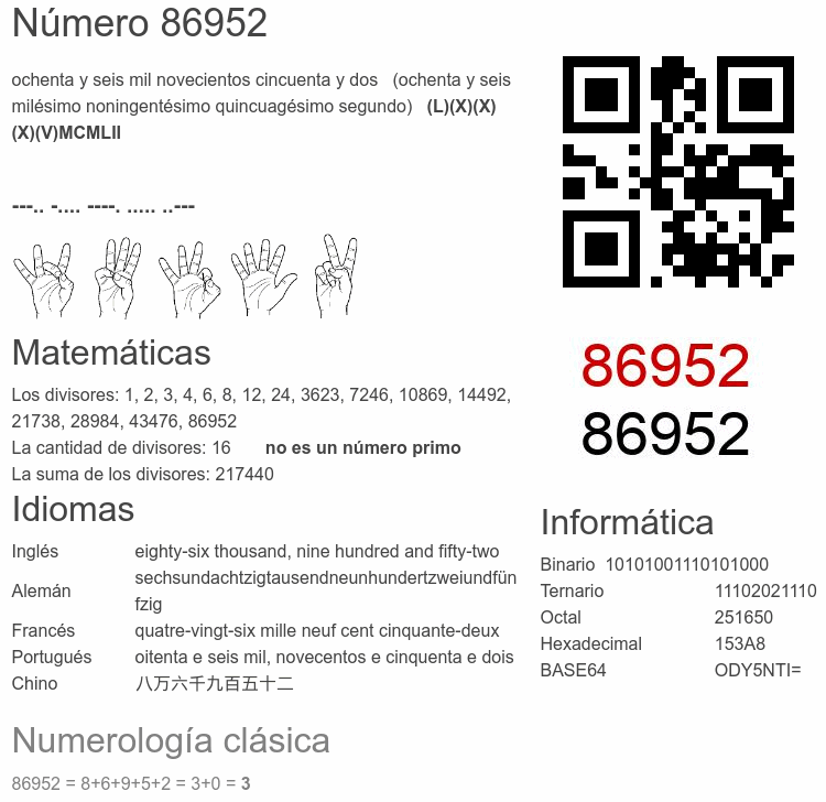Si conoce algo interesante sobre el número 86952 o cualquier número natural (entero positivo), por favor escríbanos.Número 86 952 en otras unidades