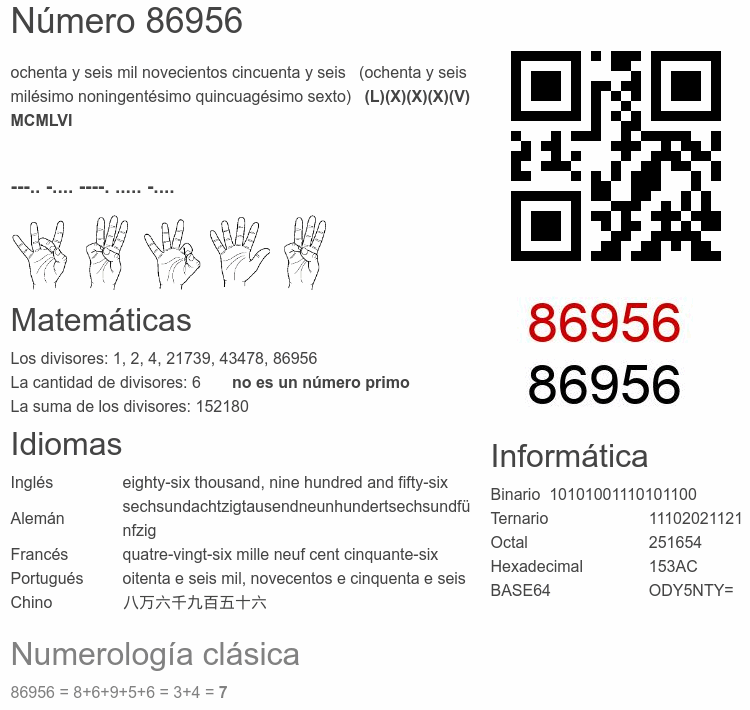 Si conoce algo interesante sobre el número 86956 o cualquier número natural (entero positivo), por favor escríbanos.Número 86 956 en otras unidades