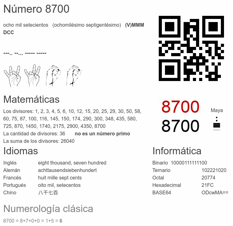 Número 8700 en el código morse: ---.. --... ----- -----Lengua de Signos Española 8700: