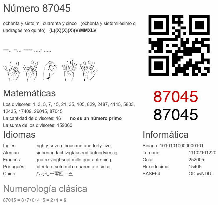 Si conoce algo interesante sobre el número 87045 o cualquier número natural (entero positivo), por favor escríbanos.Número 87 045 en otras unidades