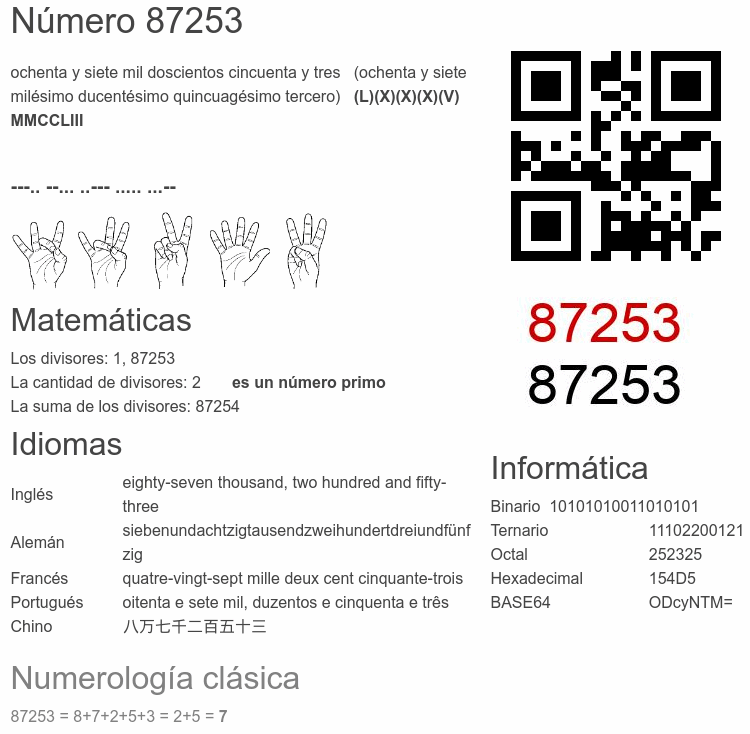 Si conoce algo interesante sobre el número 87253 o cualquier número natural (entero positivo), por favor escríbanos.Número 87 253 en otras unidades