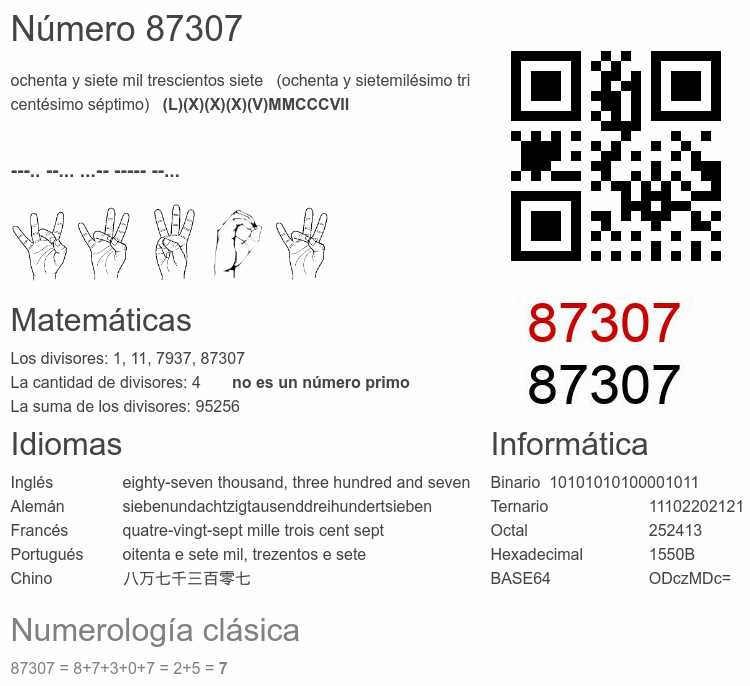 Si conoce algo interesante sobre el número 87307 o cualquier número natural (entero positivo), por favor escríbanos.Número 87 307 en otras unidades
