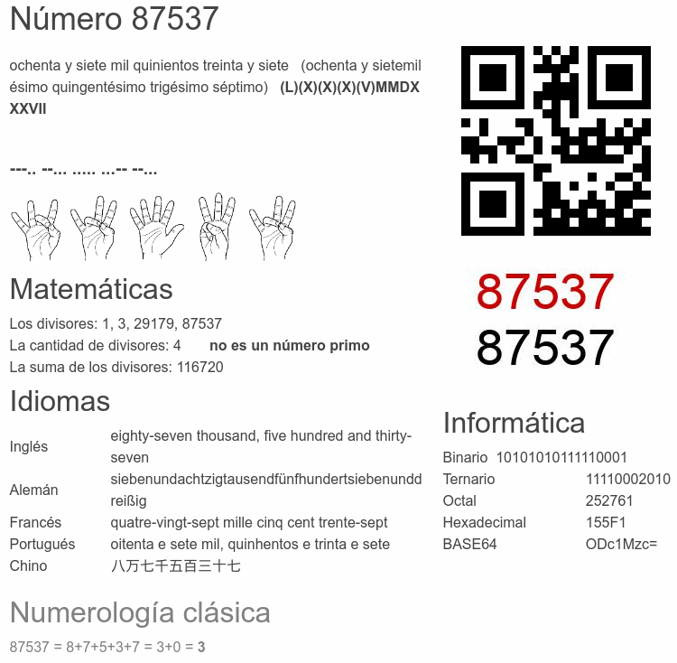 Si conoce algo interesante sobre el número 87537 o cualquier número natural (entero positivo), por favor escríbanos.Número 87 537 en otras unidades