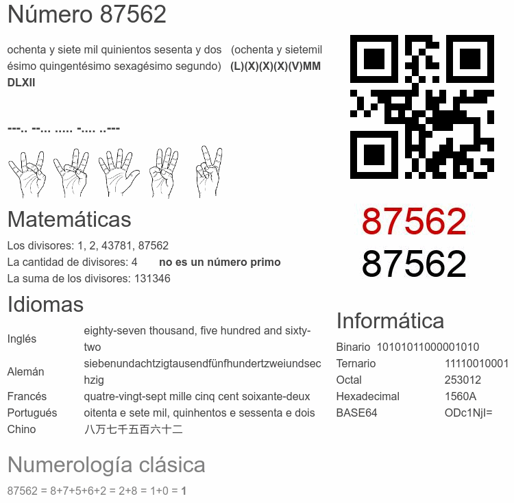 Si conoce algo interesante sobre el número 87562 o cualquier número natural (entero positivo), por favor escríbanos.Número 87 562 en otras unidades