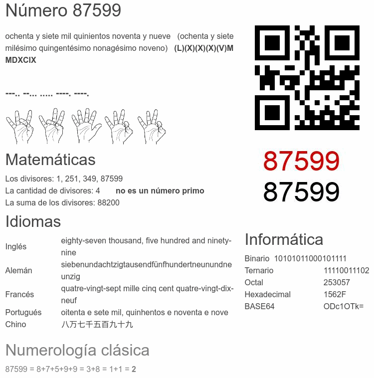 Si conoce algo interesante sobre el número 87599 o cualquier número natural (entero positivo), por favor escríbanos.Número 87 599 en otras unidades