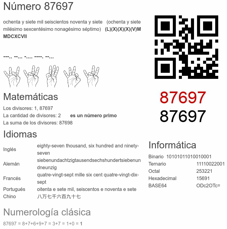Si conoce algo interesante sobre el número 87697 o cualquier número natural (entero positivo), por favor escríbanos.Número 87 697 en otras unidades