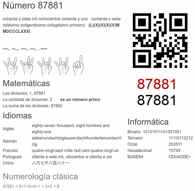 Si conoce algo interesante sobre el número 87881 o cualquier número natural (entero positivo), por favor escríbanos.Número 87 881 en otras unidades