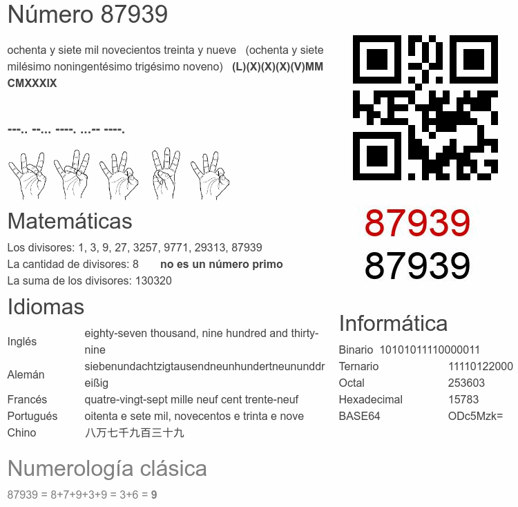 Si conoce algo interesante sobre el número 87939 o cualquier número natural (entero positivo), por favor escríbanos.Número 87 939 en otras unidades