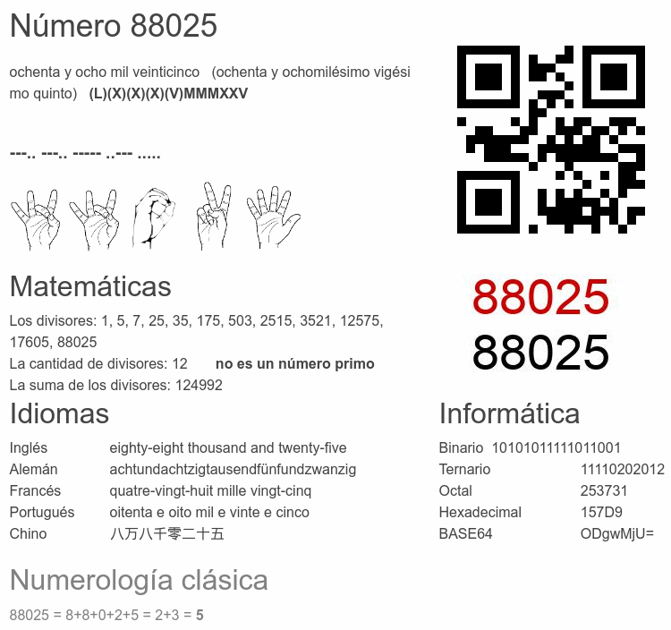 Si conoce algo interesante sobre el número 88025 o cualquier número natural (entero positivo), por favor escríbanos.Número 88 025 en otras unidades