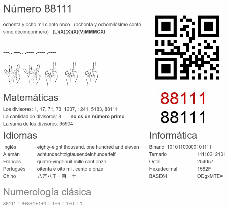 | Francés: | 🔊 (nombre 88 111) | quatre-vingt-huit mille cent onze |
