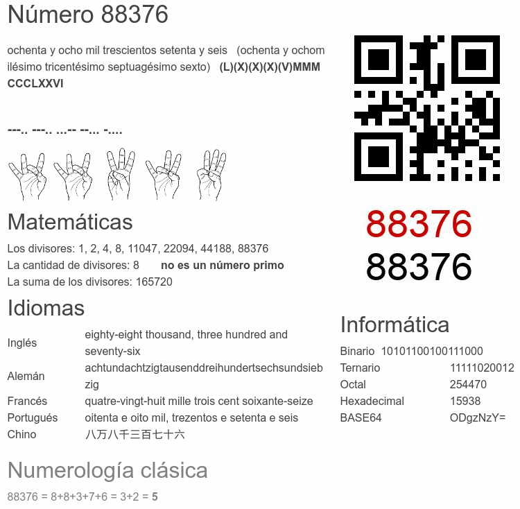 Si conoce algo interesante sobre el número 88376 o cualquier número natural (entero positivo), por favor escríbanos.Número 88 376 en otras unidades