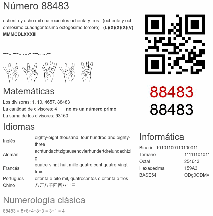 Si conoce algo interesante sobre el número 88483 o cualquier número natural (entero positivo), por favor escríbanos.Número 88 483 en otras unidades
