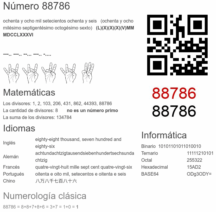 Si conoce algo interesante sobre el número 88786 o cualquier número natural (entero positivo), por favor escríbanos.Número 88 786 en otras unidades