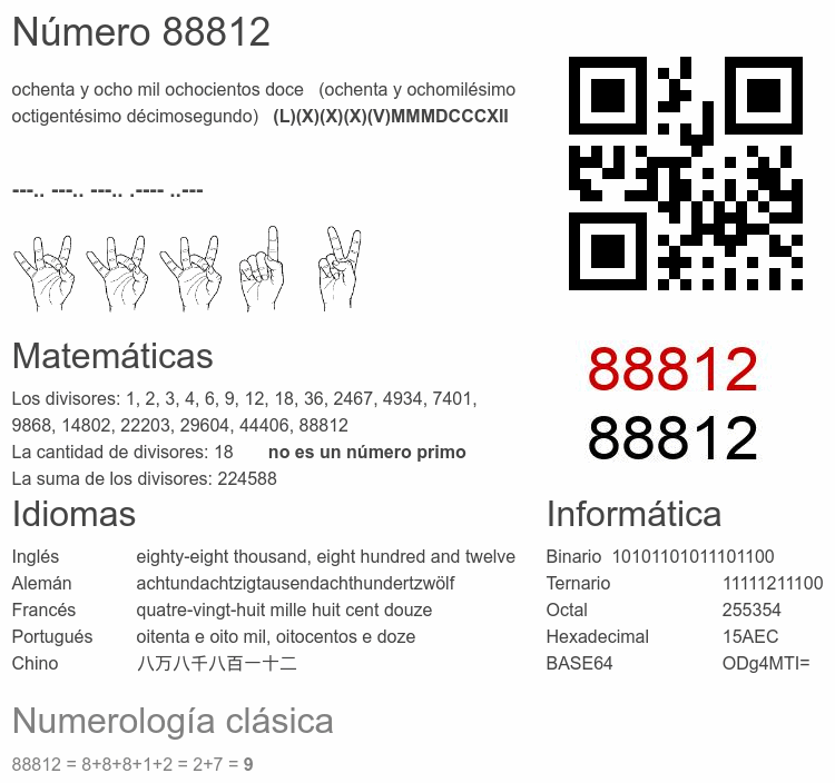 Si conoce algo interesante sobre el número 88812 o cualquier número natural (entero positivo), por favor escríbanos.Número 88 812 en otras unidades