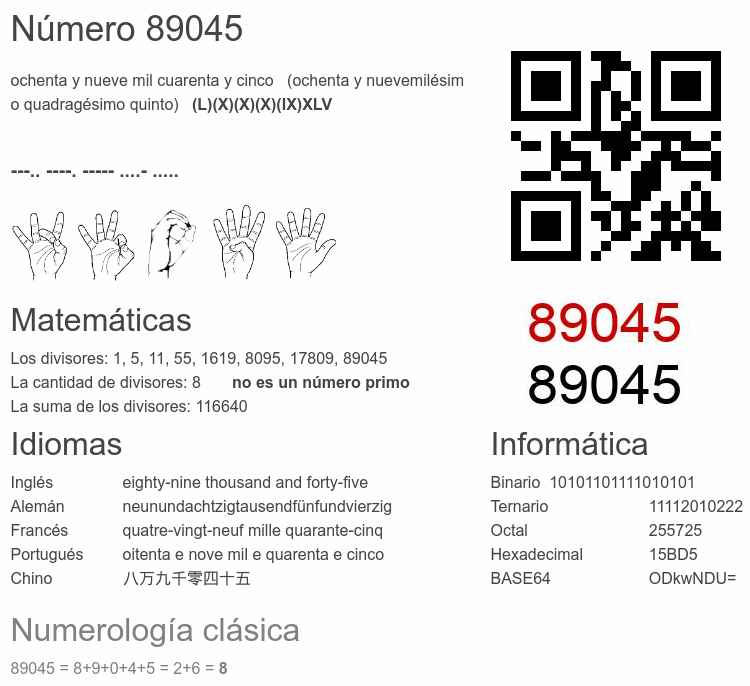 Si conoce algo interesante sobre el número 89045 o cualquier número natural (entero positivo), por favor escríbanos.Número 89 045 en otras unidades