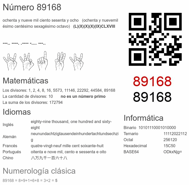 Si conoce algo interesante sobre el número 89168 o cualquier número natural (entero positivo), por favor escríbanos.Número 89 168 en otras unidades