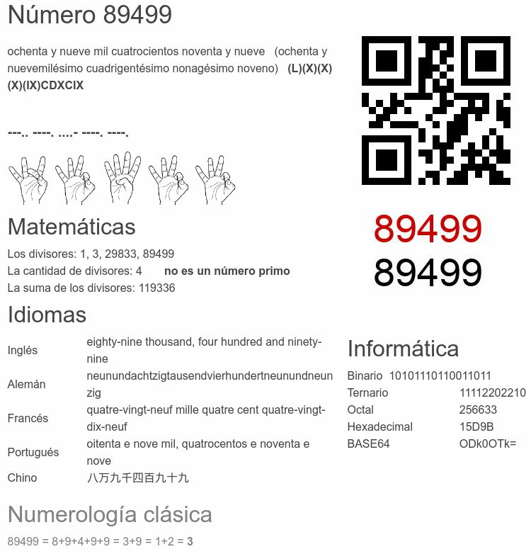 Si conoce algo interesante sobre el número 89499 o cualquier número natural (entero positivo), por favor escríbanos.Número 89 499 en otras unidades
