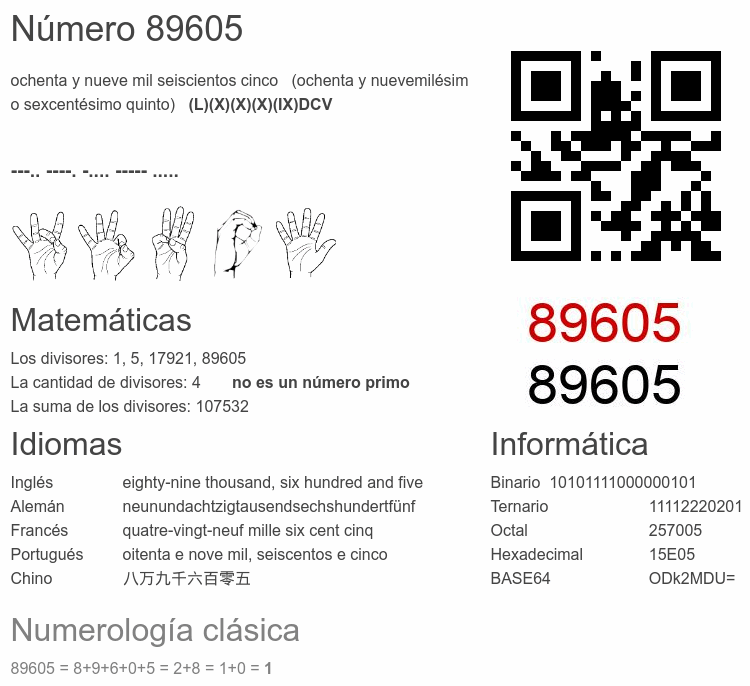 Si conoce algo interesante sobre el número 89605 o cualquier número natural (entero positivo), por favor escríbanos.Número 89 605 en otras unidades