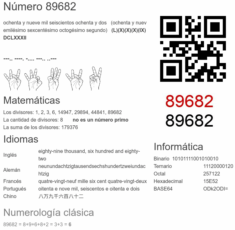 Si conoce algo interesante sobre el número 89682 o cualquier número natural (entero positivo), por favor escríbanos.Número 89 682 en otras unidades