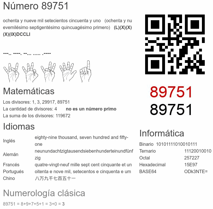 Si conoce algo interesante sobre el número 89751 o cualquier número natural (entero positivo), por favor escríbanos.Número 89 751 en otras unidades