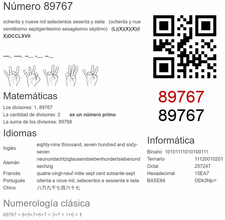 Número 89767 en el código morse: ---.. ----. --... -.... --...Lengua de Signos Española 89767: