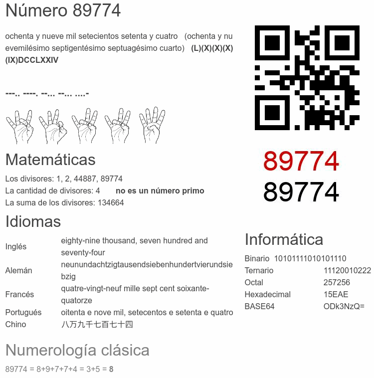 Si conoce algo interesante sobre el número 89774 o cualquier número natural (entero positivo), por favor escríbanos.Número 89 774 en otras unidades