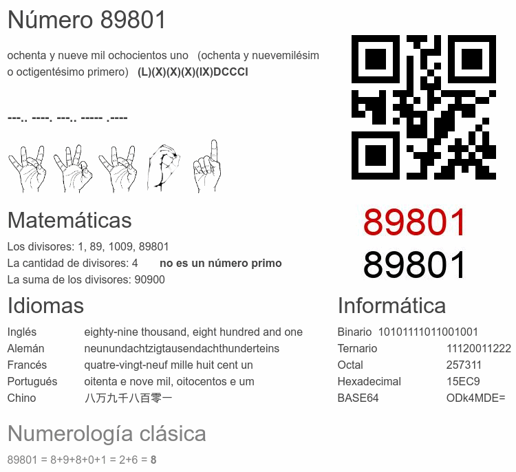 | Japonés: | 🔊 (数 89,801) | 八万九千八百一 |