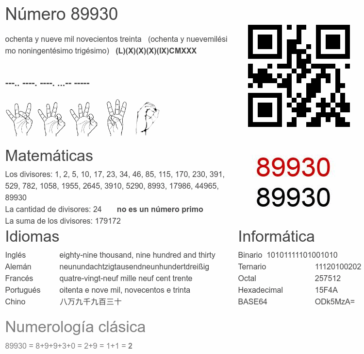 Si conoce algo interesante sobre el número 89930 o cualquier número natural (entero positivo), por favor escríbanos.Número 89 930 en otras unidades