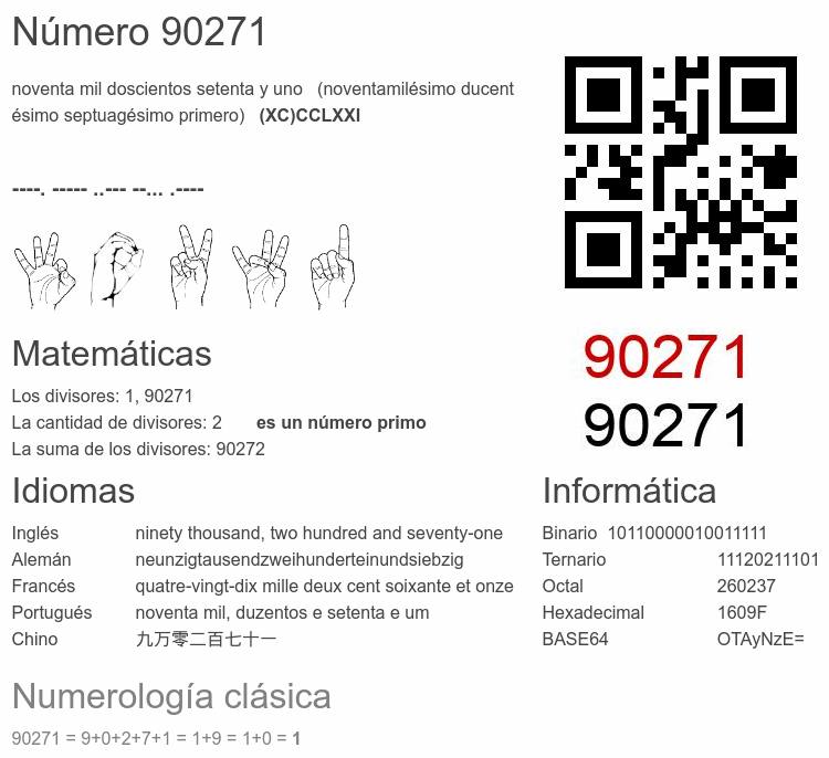 Si conoce algo interesante sobre el número 90271 o cualquier número natural (entero positivo), por favor escríbanos.Número 90 271 en otras unidades
