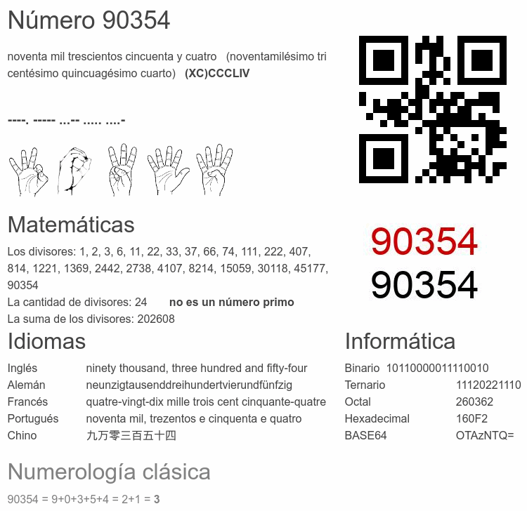 Si conoce algo interesante sobre el número 90354 o cualquier número natural (entero positivo), por favor escríbanos.Número 90 354 en otras unidades
