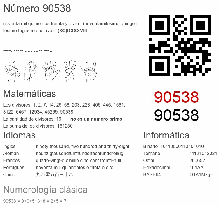 Si conoce algo interesante sobre el número 90538 o cualquier número natural (entero positivo), por favor escríbanos.Número 90 538 en otras unidades