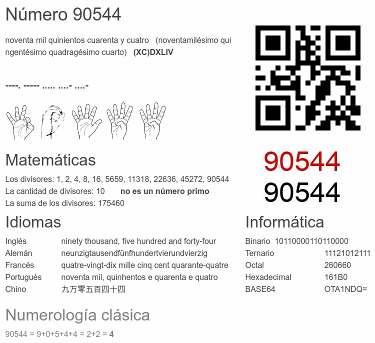 Si conoce algo interesante sobre el número 90544 o cualquier número natural (entero positivo), por favor escríbanos.Número 90 544 en otras unidades