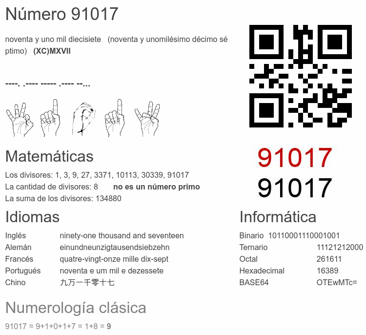 Si conoce algo interesante sobre el número 91017 o cualquier número natural (entero positivo), por favor escríbanos.Número 91 017 en otras unidades