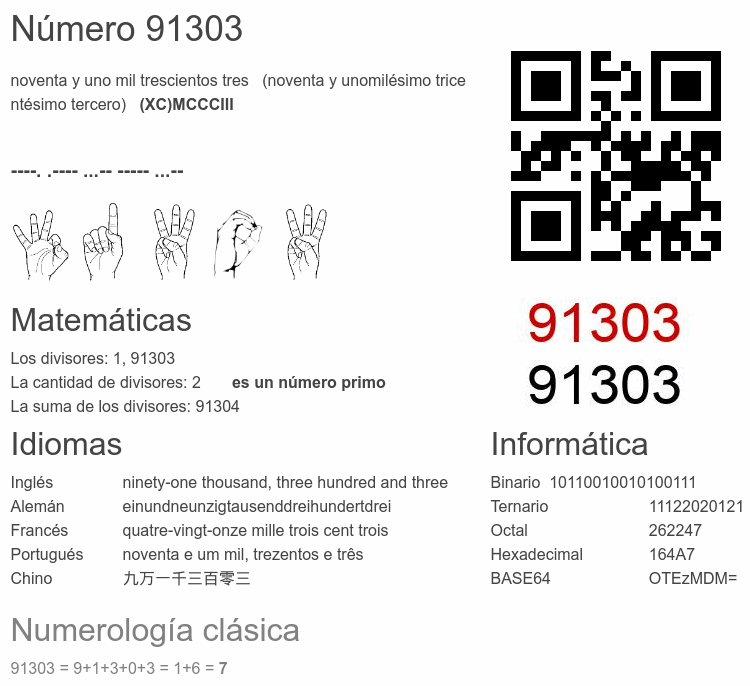 Si conoce algo interesante sobre el número 91303 o cualquier número natural (entero positivo), por favor escríbanos.Número 91 303 en otras unidades