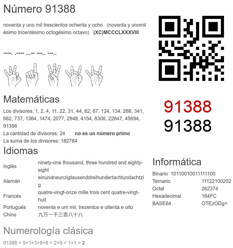 Si conoce algo interesante sobre el número 91388 o cualquier número natural (entero positivo), por favor escríbanos.Número 91 388 en otras unidades