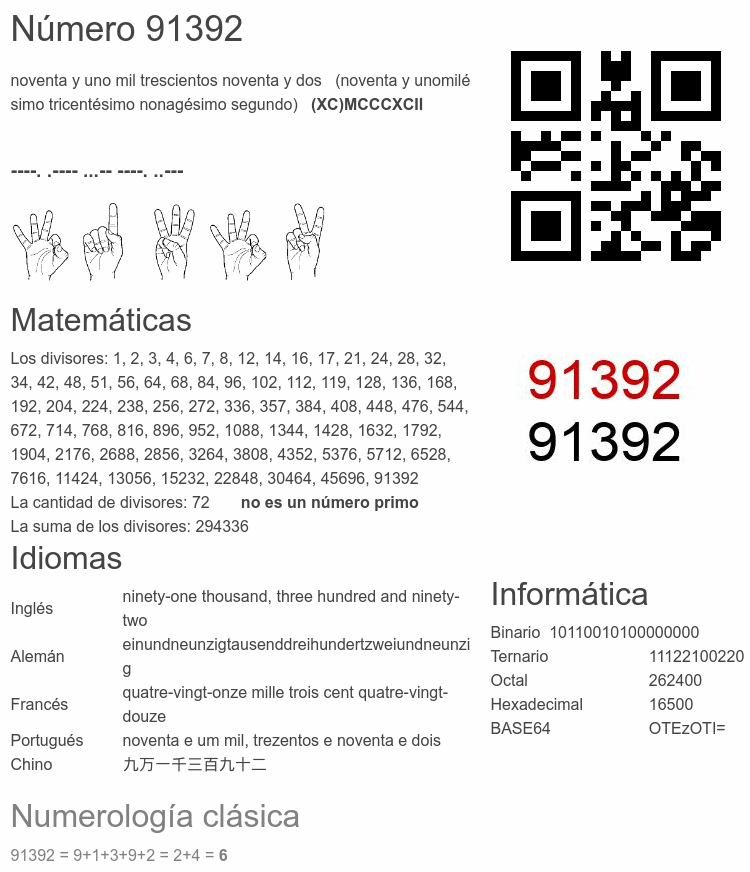 Si conoce algo interesante sobre el número 91392 o cualquier número natural (entero positivo), por favor escríbanos.Número 91 392 en otras unidades