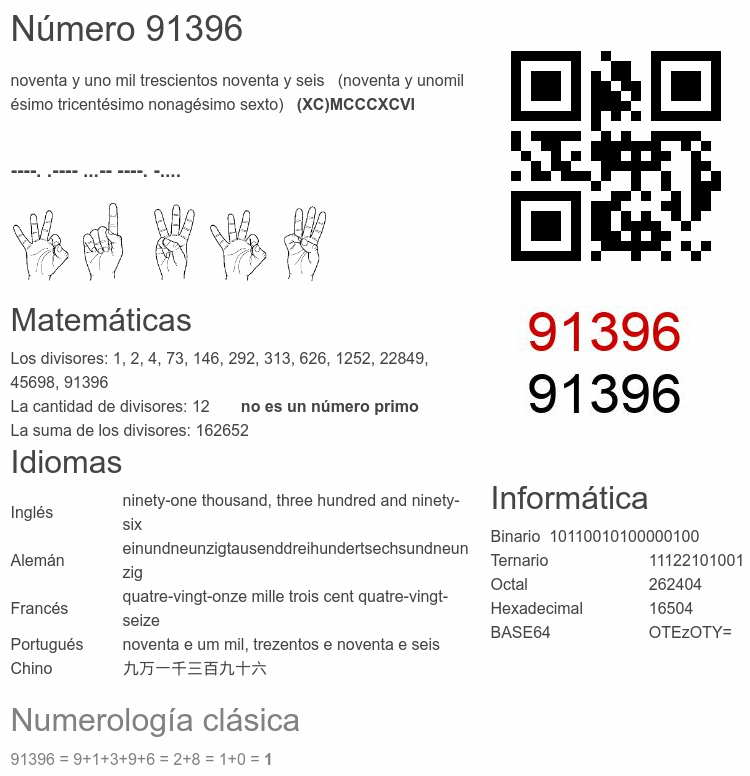 Si conoce algo interesante sobre el número 91396 o cualquier número natural (entero positivo), por favor escríbanos.Número 91 396 en otras unidades