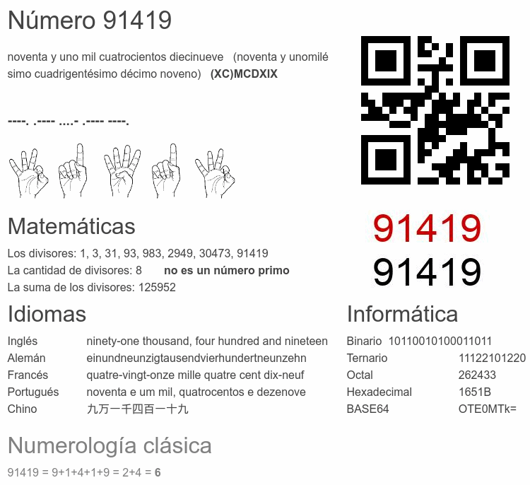 Si conoce algo interesante sobre el número 91419 o cualquier número natural (entero positivo), por favor escríbanos.Número 91 419 en otras unidades