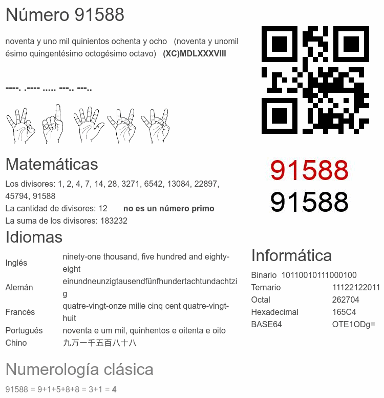 Si conoce algo interesante sobre el número 91588 o cualquier número natural (entero positivo), por favor escríbanos.Número 91 588 en otras unidades