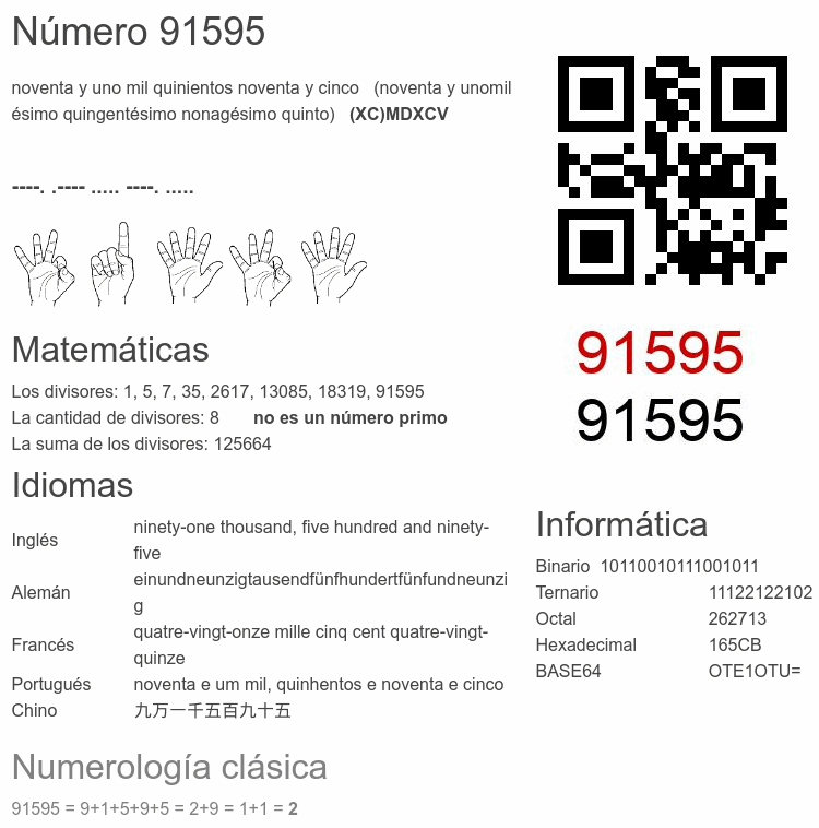 Si conoce algo interesante sobre el número 91595 o cualquier número natural (entero positivo), por favor escríbanos.Número 91 595 en otras unidades