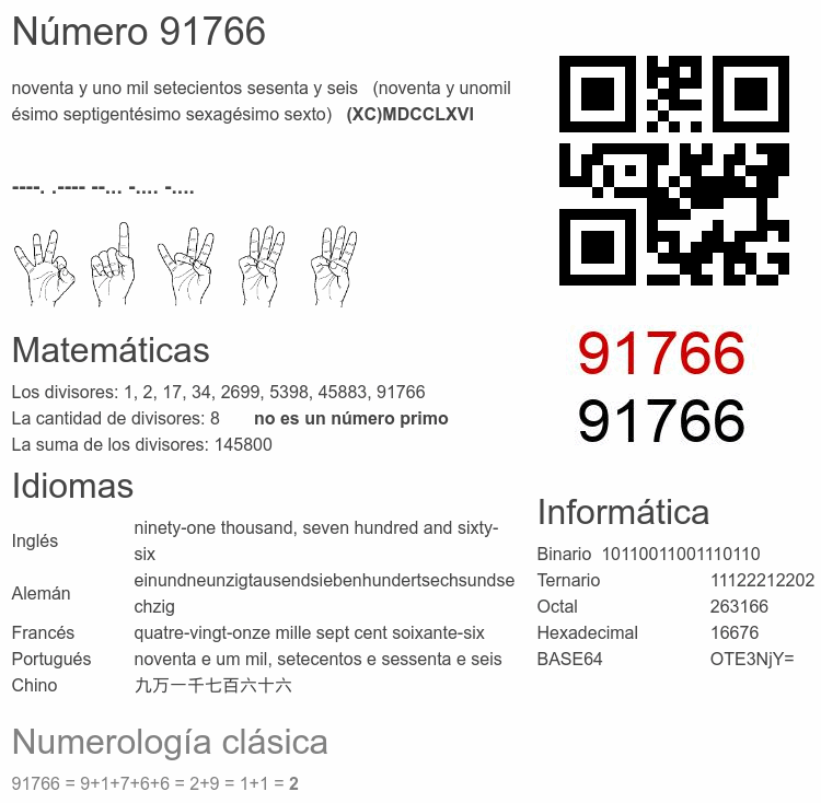 Si conoce algo interesante sobre el número 91766 o cualquier número natural (entero positivo), por favor escríbanos.Número 91 766 en otras unidades