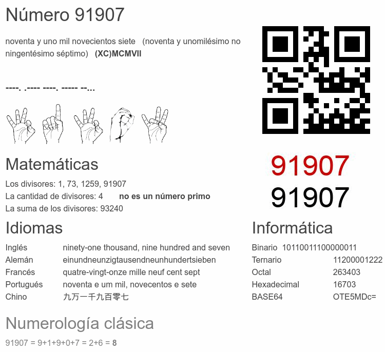 Si conoce algo interesante sobre el número 91907 o cualquier número natural (entero positivo), por favor escríbanos.Número 91 907 en otras unidades
