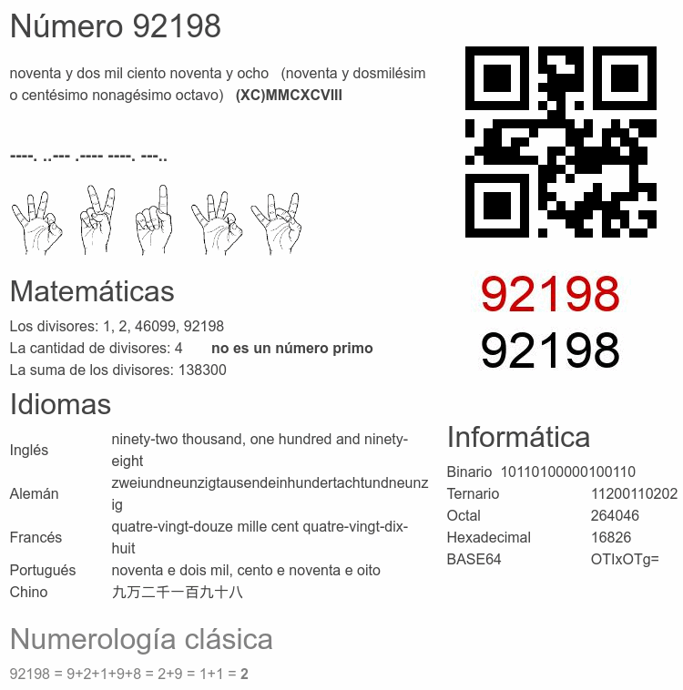 Si conoce algo interesante sobre el número 92198 o cualquier número natural (entero positivo), por favor escríbanos.Número 92 198 en otras unidades