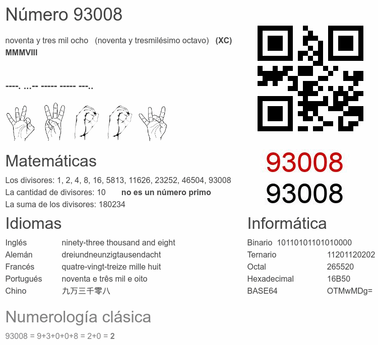 El número par 93 008 se dice 🔊, y se escribe con las palabras: noventa y tres mil ocho. El número ordinal 93008.° se dice 🔊 y se escribe como: noventa y tresmilésimo octavo. El significado del número 93008 en Matemáticas: Es un primo? Factorización y árbol de factores primos. La raíz cuadrada de y la raíz cúbica de 93008. El significado en informática, numerología, códigos e imágenes, escritura y denominación en otras lenguas. Otras curiosidades relacionadas con el 93008.