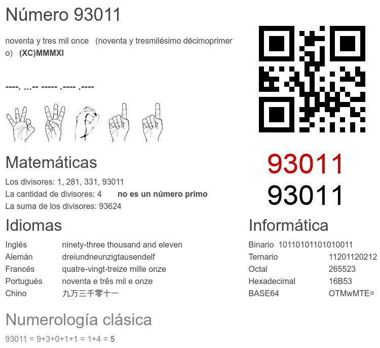 El número impar 93 011 se dice 🔊, y se escribe con las palabras: noventa y tres mil once. El número ordinal 93011.° se dice 🔊 y se escribe como: noventa y tresmilésimo décimoprimero. El significado del número 93011 en Matemáticas: Es un primo? Factorización y árbol de factores primos. La raíz cuadrada de y la raíz cúbica de 93011. El significado en informática, numerología, códigos e imágenes, escritura y denominación en otras lenguas. Otras curiosidades relacionadas con el 93011.