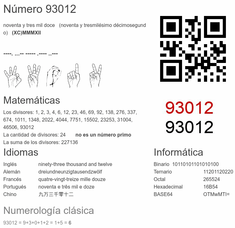 El número par 93 012 se dice 🔊, y se escribe con las palabras: noventa y tres mil doce. El número ordinal 93012.° se dice 🔊 y se escribe como: noventa y tresmilésimo décimosegundo. El significado del número 93012 en Matemáticas: Es un primo? Factorización y árbol de factores primos. La raíz cuadrada de y la raíz cúbica de 93012. El significado en informática, numerología, códigos e imágenes, escritura y denominación en otras lenguas. Otras curiosidades relacionadas con el 93012.