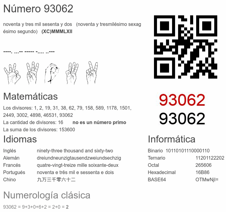 El número par 93 062 se dice 🔊, y se escribe con las palabras: noventa y tres mil sesenta y dos. El número ordinal 93062.° se dice 🔊 y se escribe como: noventa y tresmilésimo sexagésimo segundo. El significado del número 93062 en Matemáticas: Es un primo? Factorización y árbol de factores primos. La raíz cuadrada de y la raíz cúbica de 93062. El significado en informática, numerología, códigos e imágenes, escritura y denominación en otras lenguas. Otras curiosidades relacionadas con el 93062.