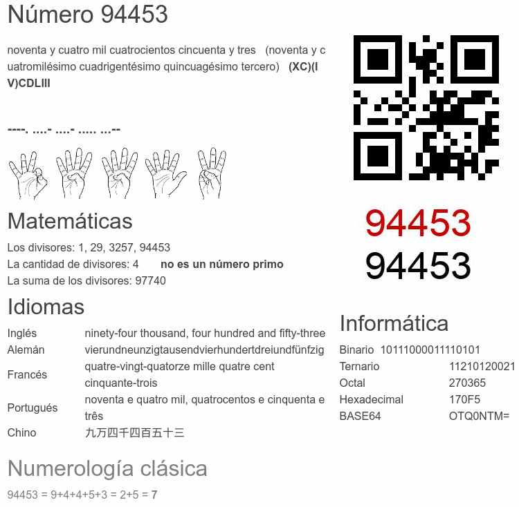 Si conoce algo interesante sobre el número 94453 o cualquier número natural (entero positivo), por favor escríbanos.Número 94 453 en otras unidades